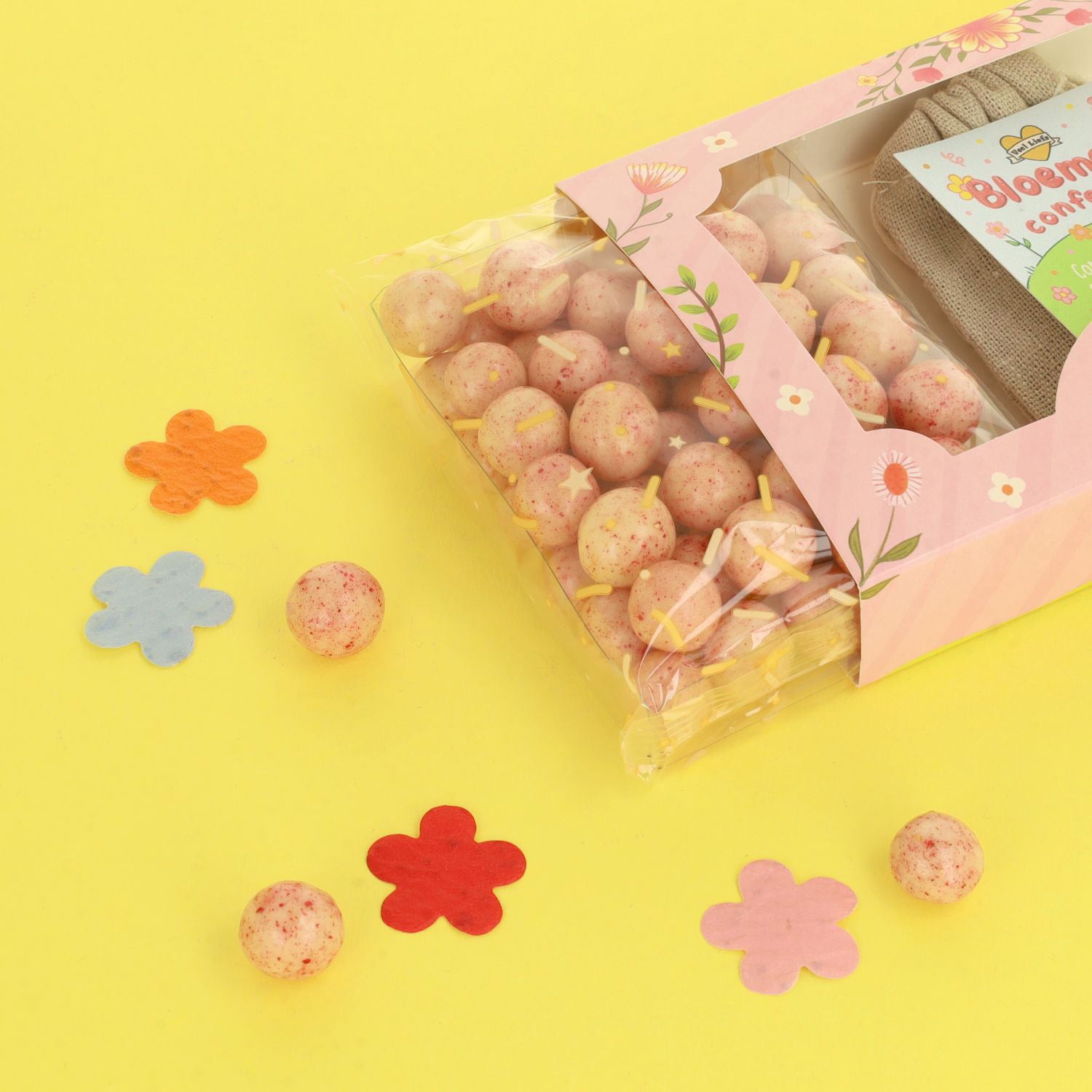 In de bolletjes en bloemen confetti zitten zaadjes van wilde bloemen die buiten het gelukkigst zijn. Dus, strooi ze uit in de buitenlucht.